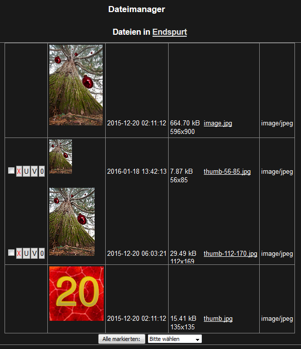 Falls Sie den Dateimanager von der Vollansicht eines Bildes aus aufgerufen haben, sehen sie neben dem Originalbild kleinere Vorschaubilder in unteschiedlichen Größen. Diese Thumbs erzeugt das System automatisch beim Einstellen des Originalbildes und speichert sie zusammen mit diesem ab. Gegebenenfalls zeigt Ihnen der Dateimanager auch weitere Bilder an, falls Sie bereits zu einem früheren Zeitpunkt andere Dateien zu dem Ursprungsobjekt verschoben haben. Bei Textbeiträgen sehen Sie zunächst keine Dateien im Objektbereich.