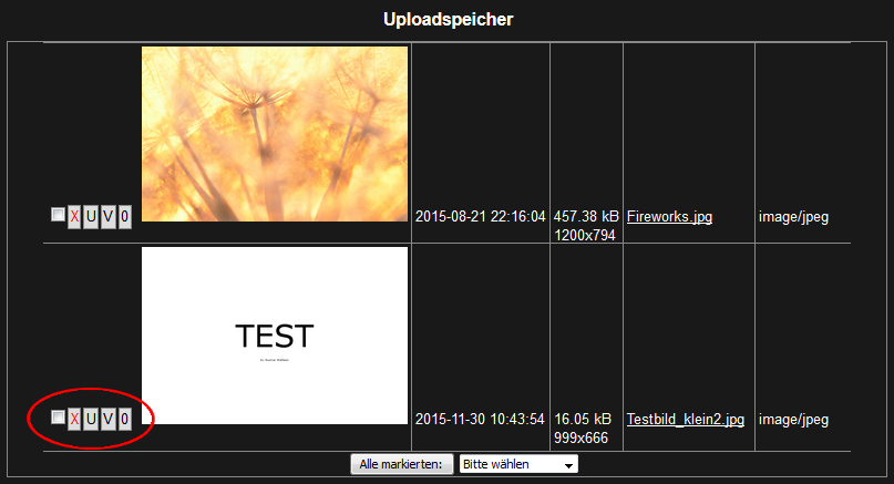 Sowohl in der Übersicht zum Objekt als auch in der Übersicht Ihres Speicherinhalts befindet sich links neben den aufgelisteten Dateien eine Reihe mit Schaltflächen: [X], [U], [V], [0] (siehe roter Kreis im Bild "Uploadspeicher" weiter oben). Je nach Situation können (weitere) Funktionen hinzukommen oder entfallen.